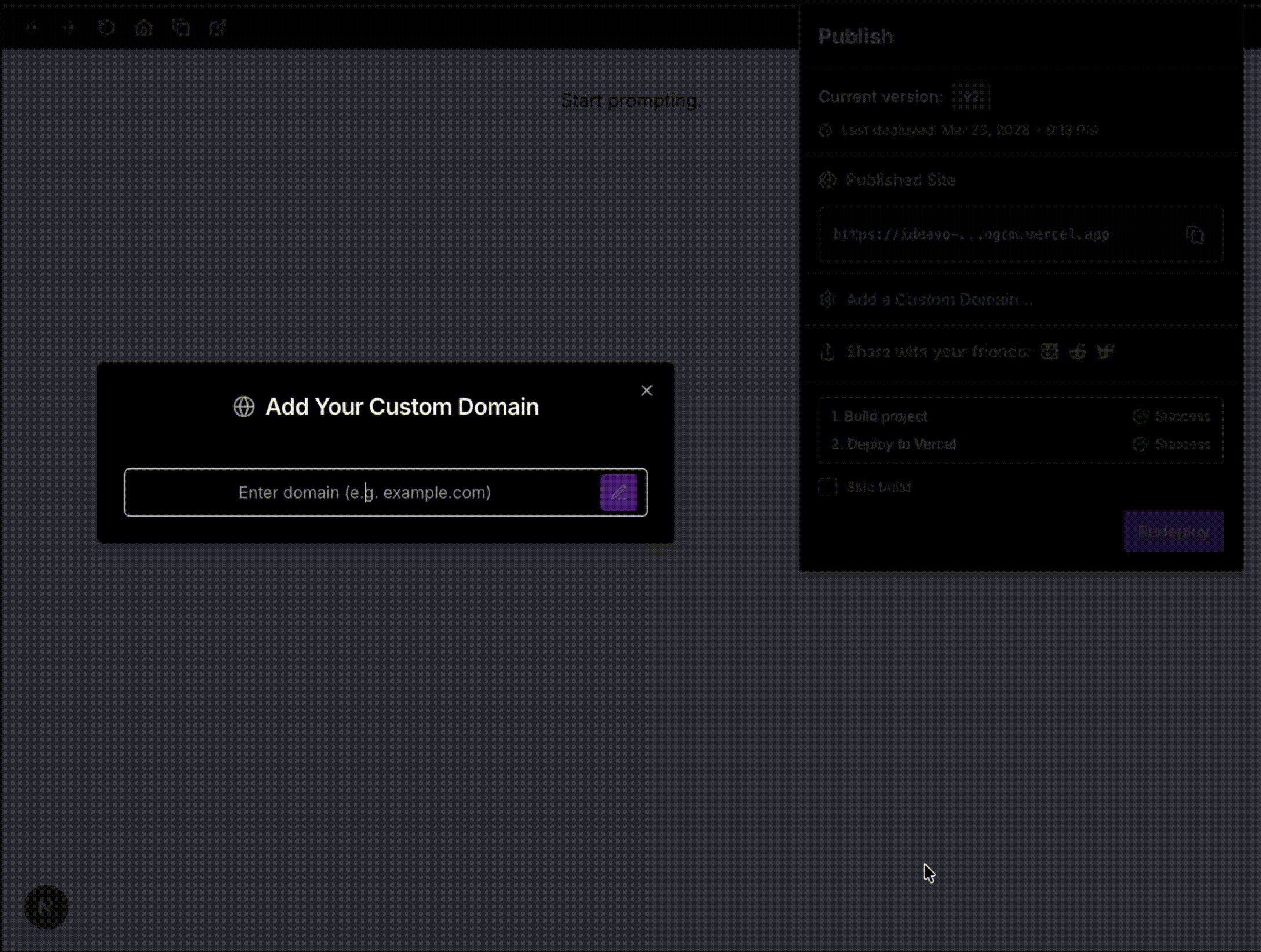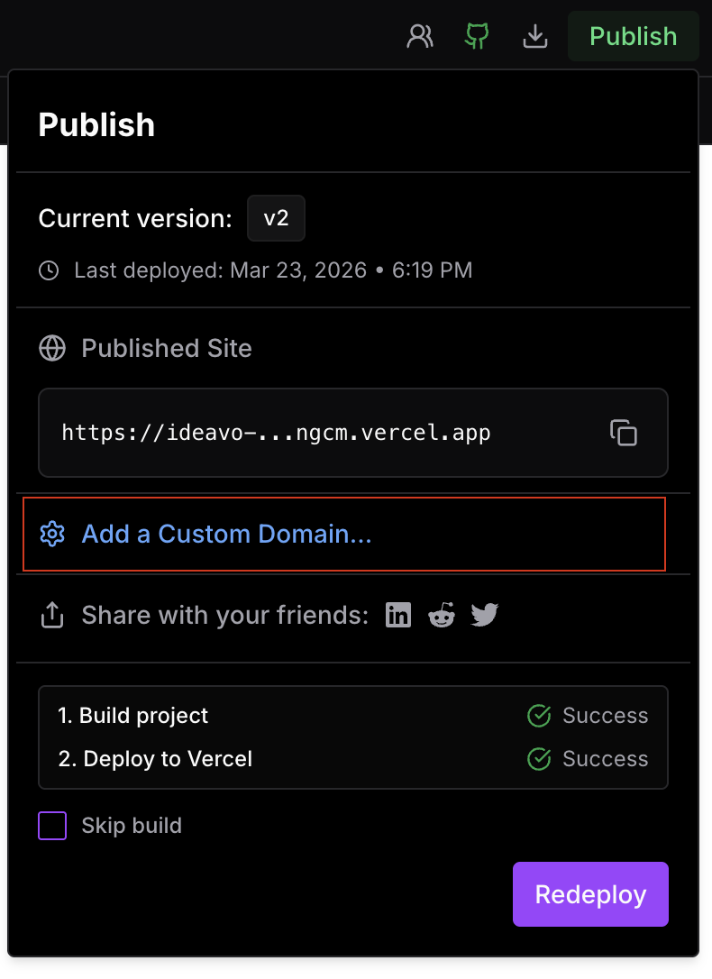 Once your project is deployed, you can attach a custom domain to it from the post-deployment panel. Ideavo handles the domain linkage through your connected Vercel account and guides you through DNS configuration.