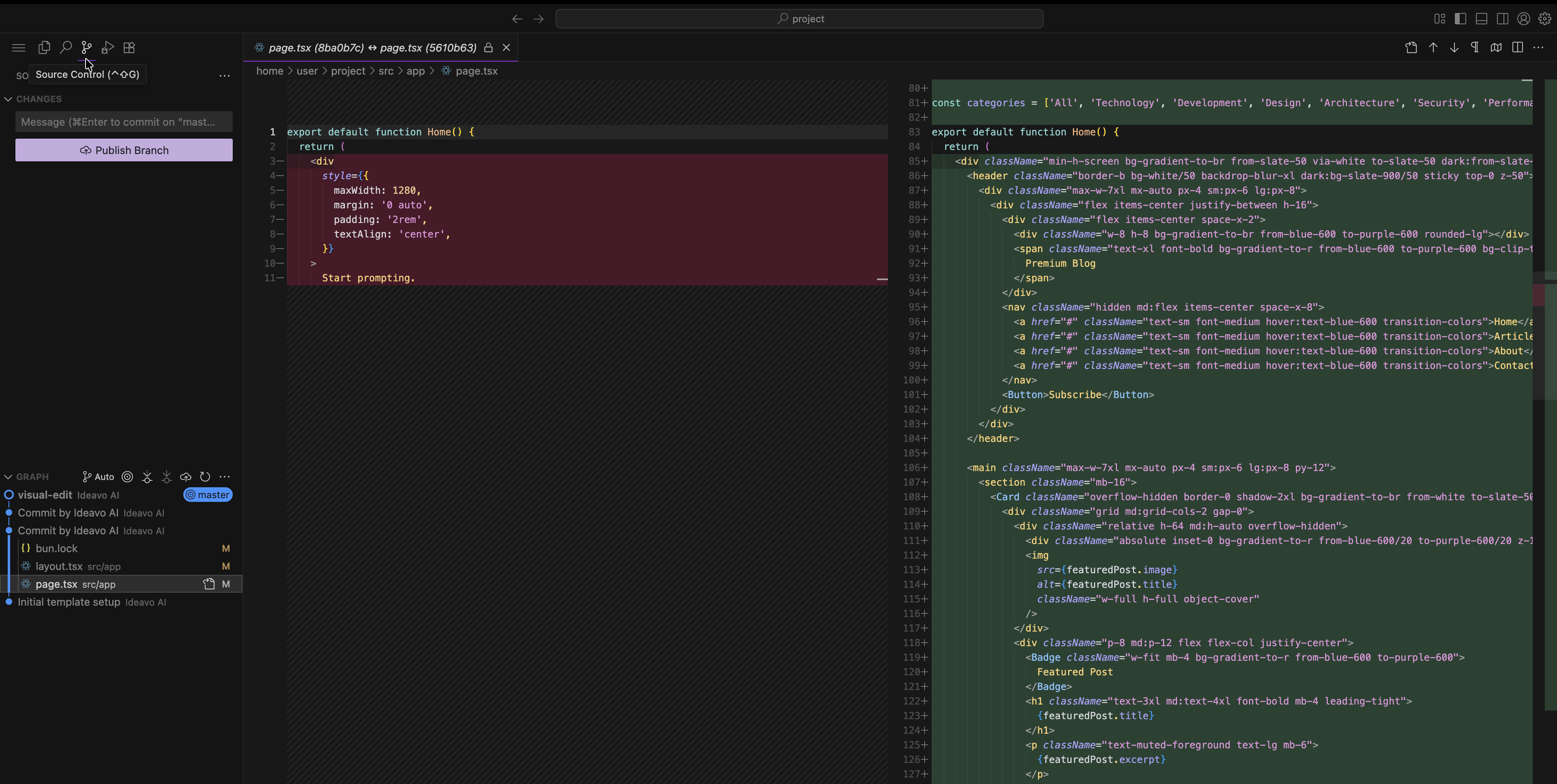 The IDE includes built-in source control for staging, committing, and reviewing changes with diff visualization.