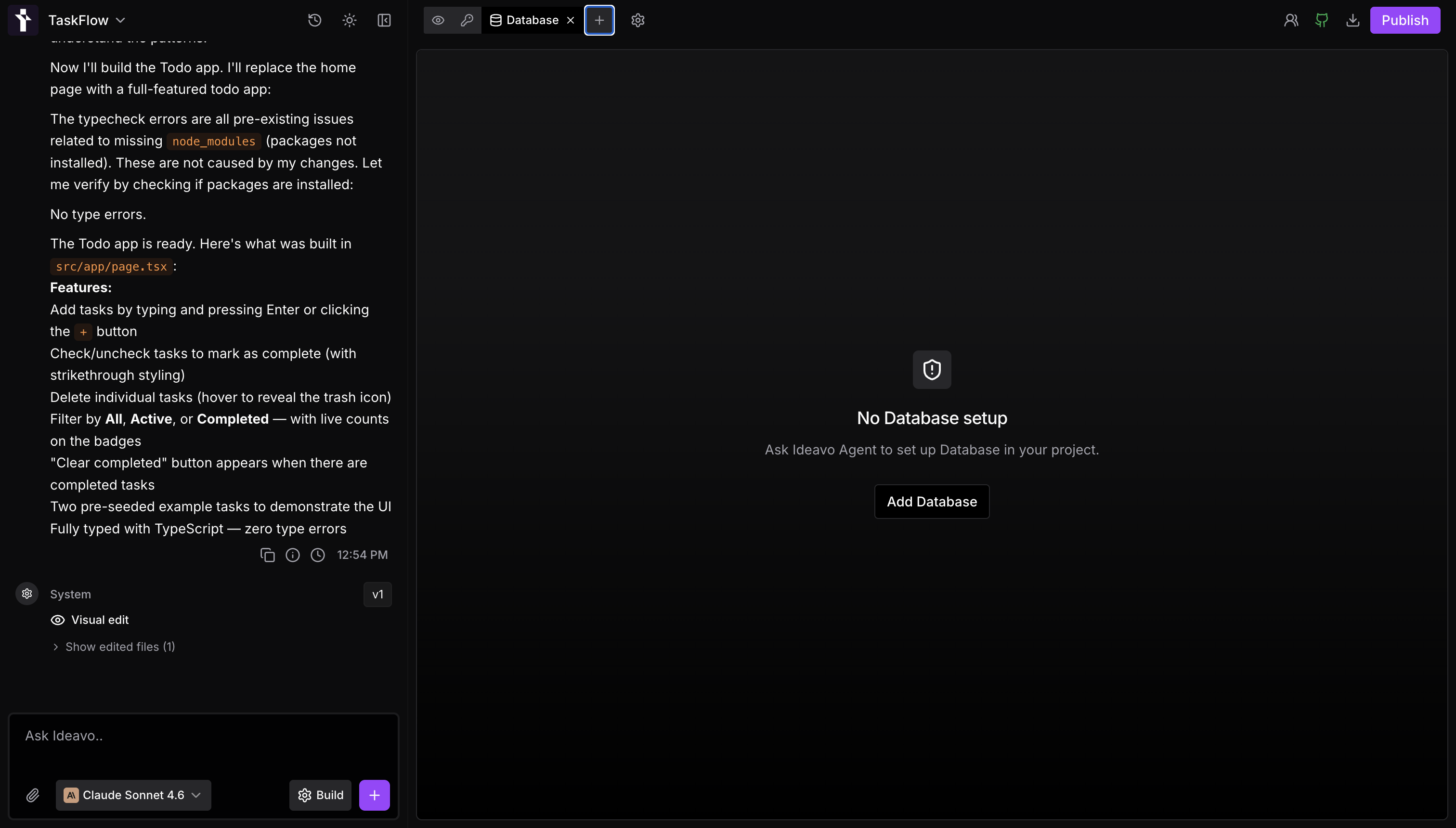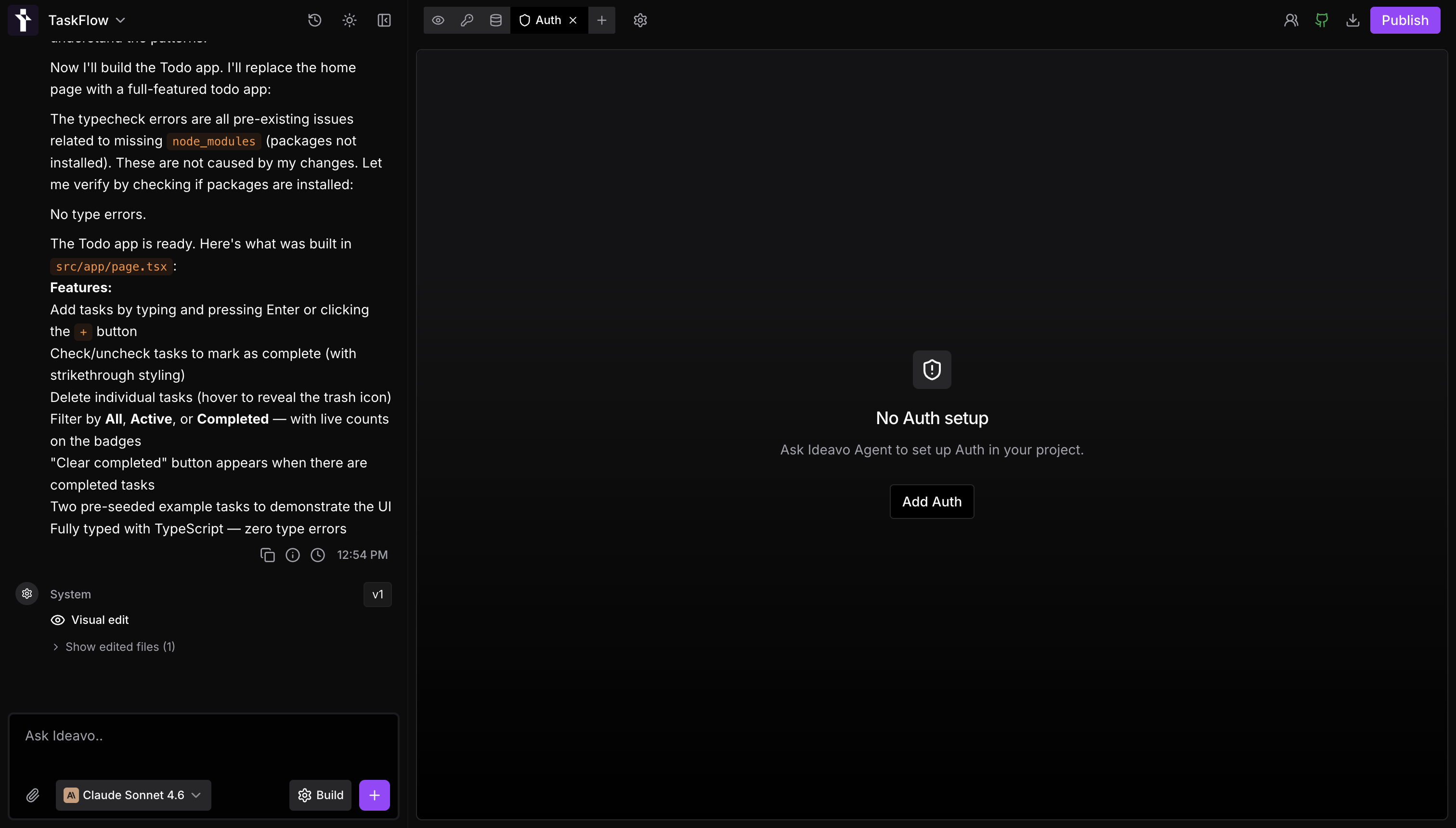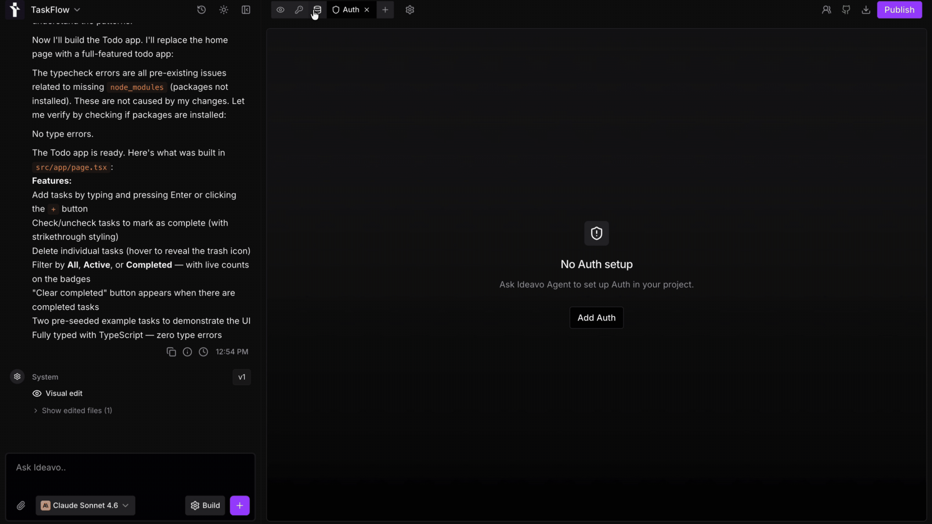 One-click database and auth setup, plus connect any third-party service — all managed by the Ideavo agent.