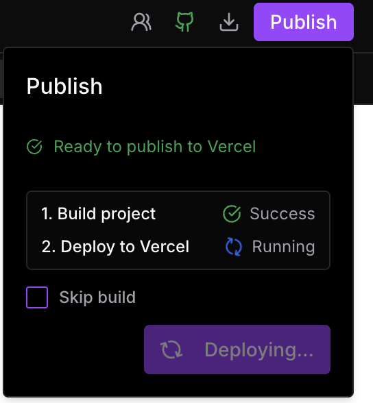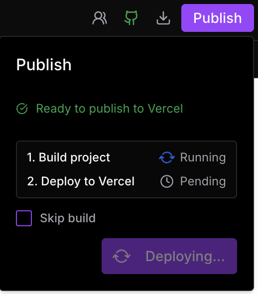 When deploying, you'll see a Skip Build option. If checked, the build step is bypassed and your project is pushed directly to Vercel.