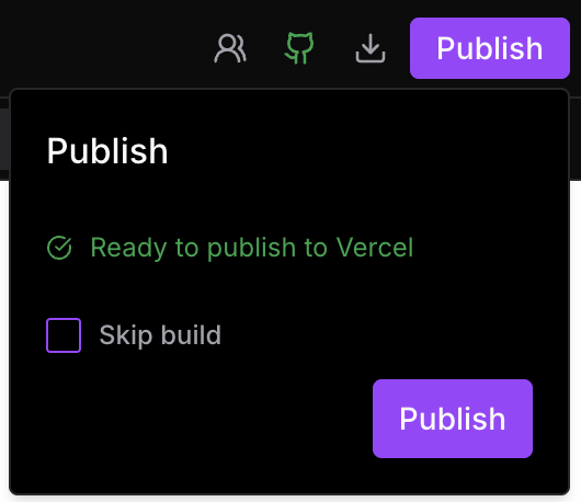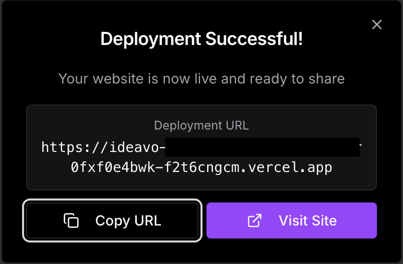 Publish deploys your project to Vercel and gives it a live production URL. Once connected, you can deploy, redeploy, and manage your deployment directly from inside Ideavo.
