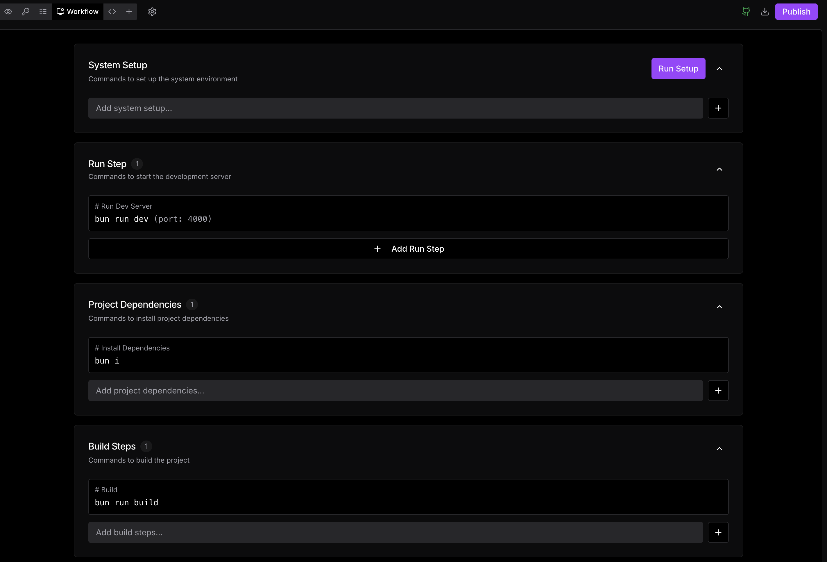 Commands to start the development server. The agent pre-fills this based on your framework (e.g. bun run dev --port 4000). Use + Add Run Step to add multiple run steps for projects with parallel services.